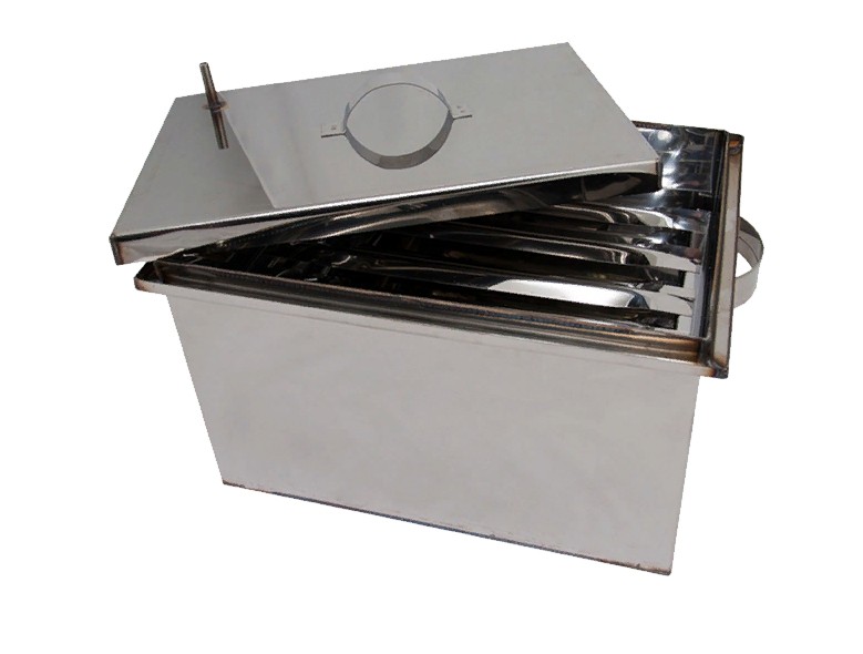 Коптильня изготовлена из нержавеющей стали толщиной 1мм. Имеет 2 уровня для продуктов, поддон для сбора жира и так называемый «гидрозатвор» в верхней части благодаря этому, создается давление и копчение происходит более быстро и качественно.